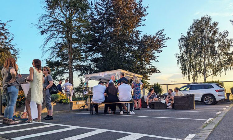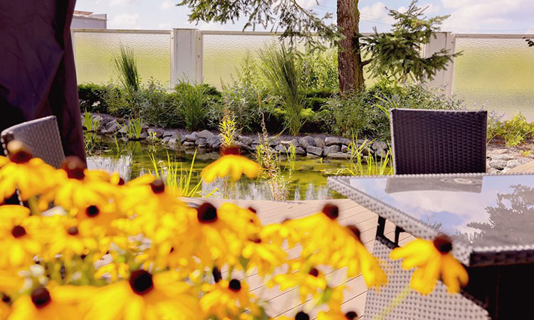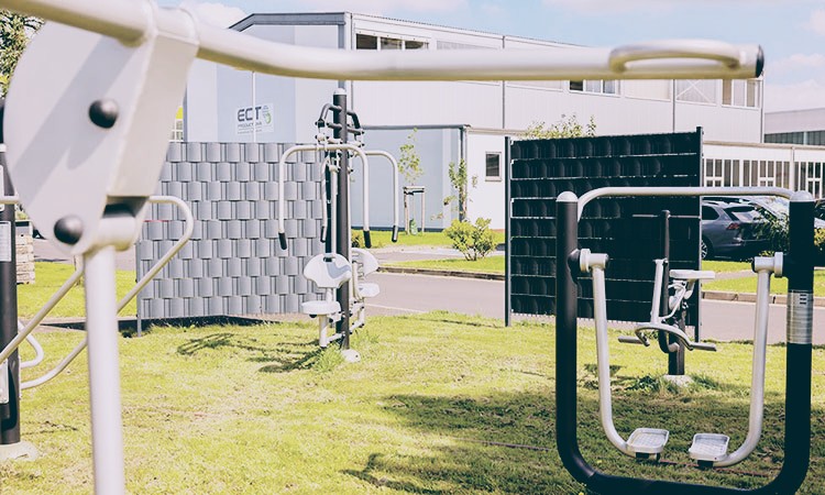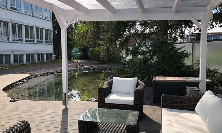 Du brauchst etwas Bewegung oder Ablenkung? Unsere Outdoor-Lounge mit Teich und ein Fitness-Parcour direkt am Gebäude sind für jeden CoWorker frei nutzbar.